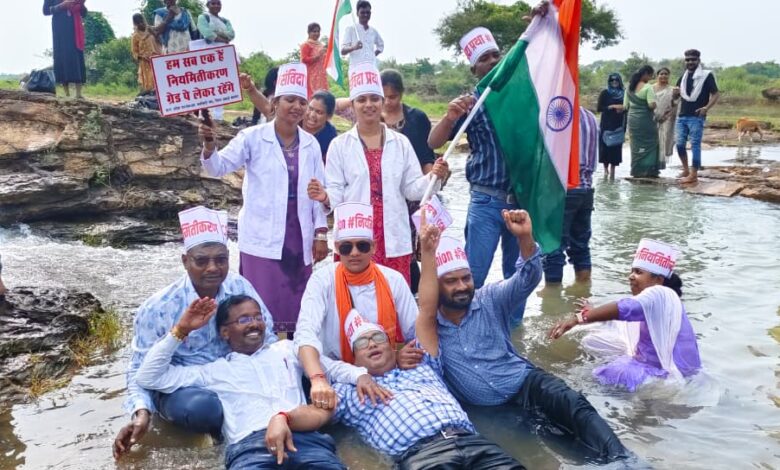 छत्तीसगढ़ प्रदेश राष्ट्रीय स्वास्थ्य मिशन (एनएचएम) कर्मचारी संघ द्वारा नियमितीकरण, ग्रेड पे, 27% वेतन वृद्धि सहित 10 सूत्रीय मांगों को लेकर चल रहा अनिश्चितकालीन आंदोलन 23वें दिन और तेज हो गया। आज कर्मचारियों ने बालोद के तांदुला डैम में जल सत्याग्रह और नारेबाजी कर अपनी मांगों को बुलंद किया।