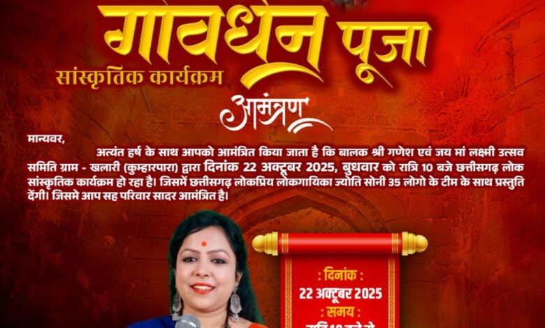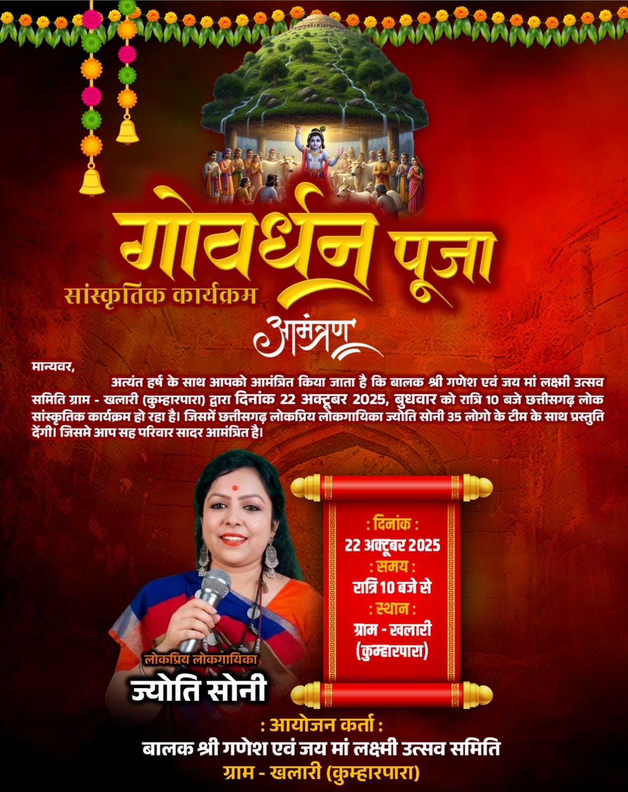 यह कार्यक्रम छत्तीसगढ़ की जीवंत लोक धुनों का अनुपम संगम होगा। आयोजक समिति ने सभी को आमंत्रित किया है—परिवार सहित शाम 10 बजे कुम्हार पारा पहुंचें और ज्योति सोनी के सुरों में डूब जाएं! अधिक जानकारी के लिए स्थानीय समिति से संपर्क करें।