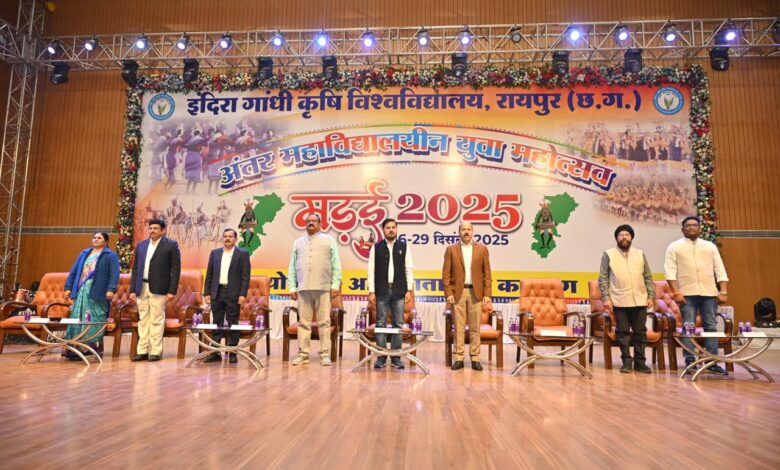 धरसींवा | धरसींवा विधानसभा क्षेत्र के जोरा स्थित इंदिरा गांधी कृषि विश्वविद्यालय, रायपुर परिसर में आयोजित अंतर-महाविद्यालयीन युवा महोत्सव ‘मड़ई-2025’ का भव्य शुभारंभ मुख्य अतिथि विधायक अनुज शर्मा के करकमलों से हुआ। इस अवसर पर सांस्कृतिक उल्लास, युवा ऊर्जा और छत्तीसगढ़ी परंपरा का अनूठा संगम देखने को मिला।